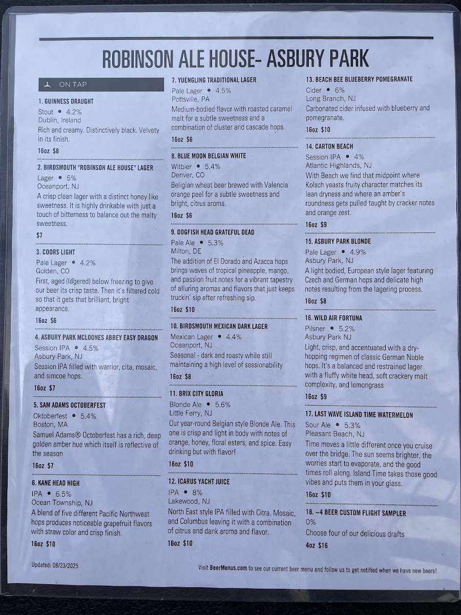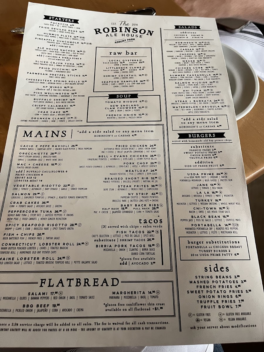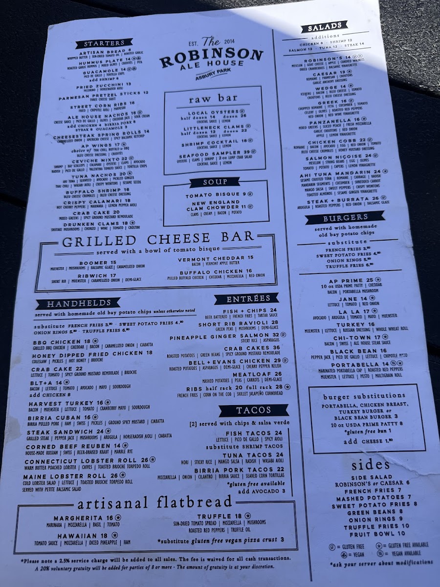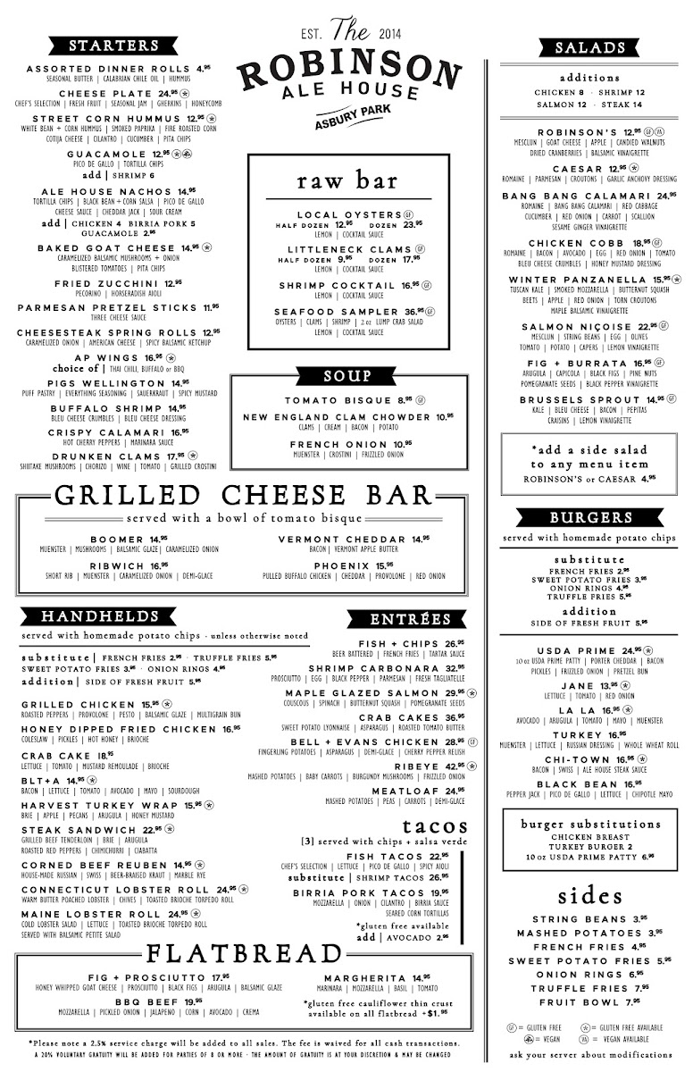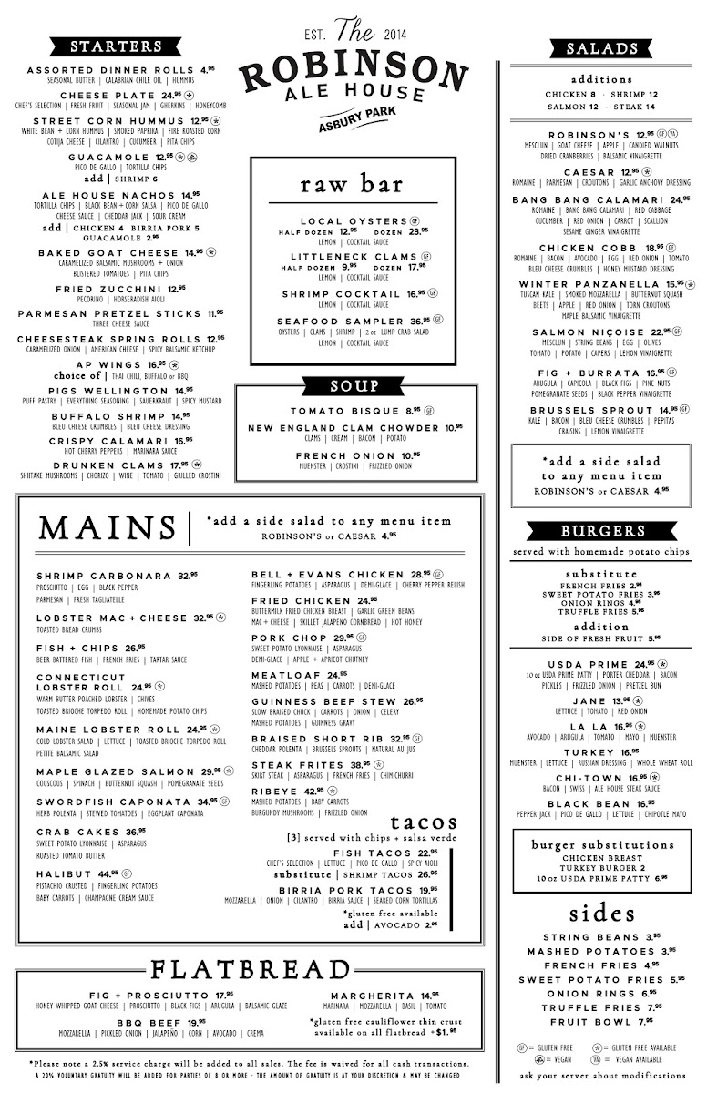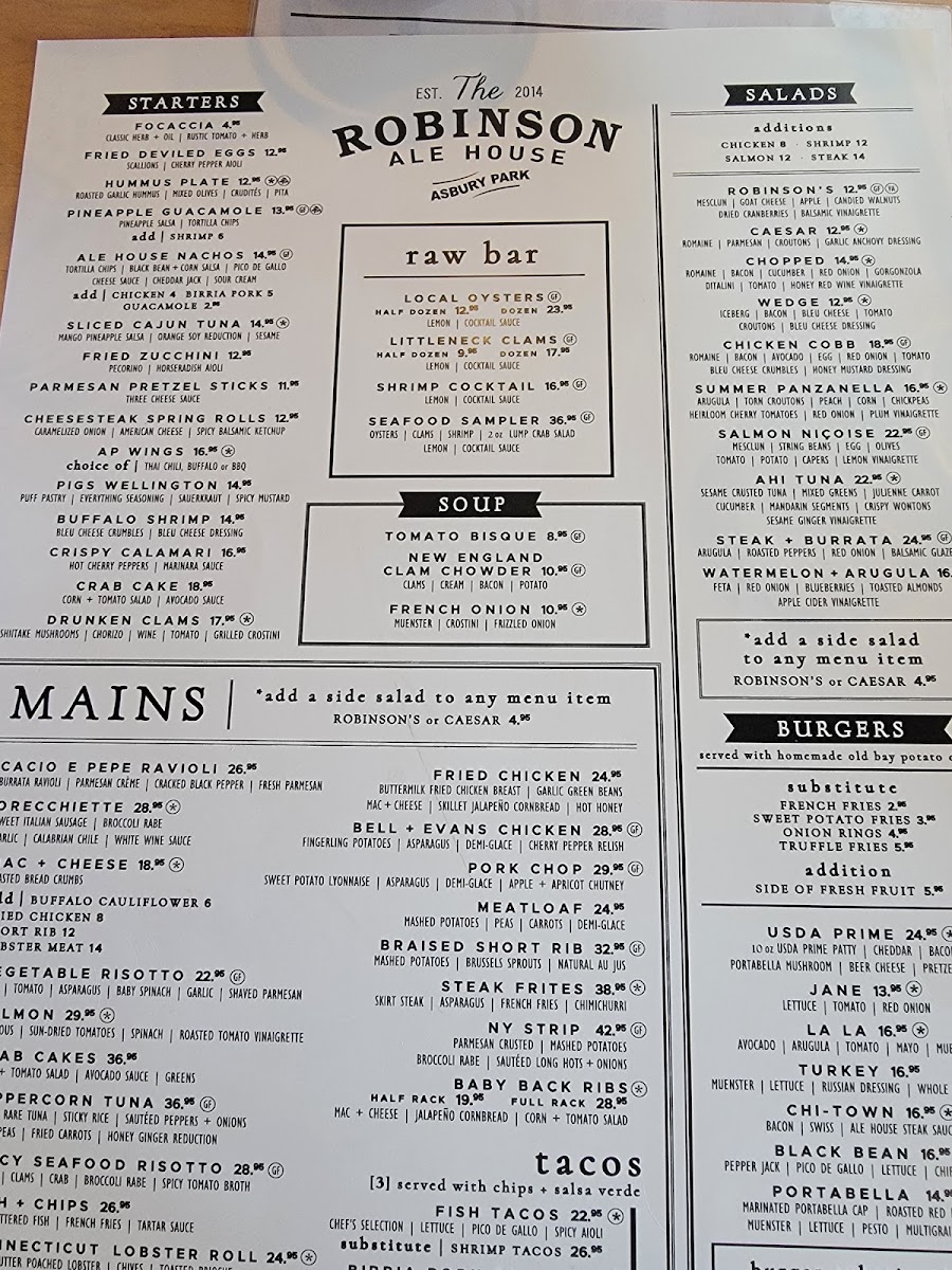 The Robinson Ale House Menu offers a delightful variety of comfort food with a twist, perfect for any occasion. Located at 1200 Ocean Ave N, Asbury Park, NJ, this spot is a go-to for locals and visitors alike. From mouthwatering appetizers to hearty entrees, the menu is designed to satisfy a range of tastes. Whether you're in the mood for a classic burger, fresh seafood, or something with a little more flair, there’s always something to enjoy. For those who prefer lighter fare, the selection of salads and lighter bites will hit the spot without compromising on flavor. The Robinson Ale House also serves up some amazing craft beers, ideal for pairing with your meal. It’s a great place to kick back, relax, and enjoy delicious food in a laid-back atmosphere.